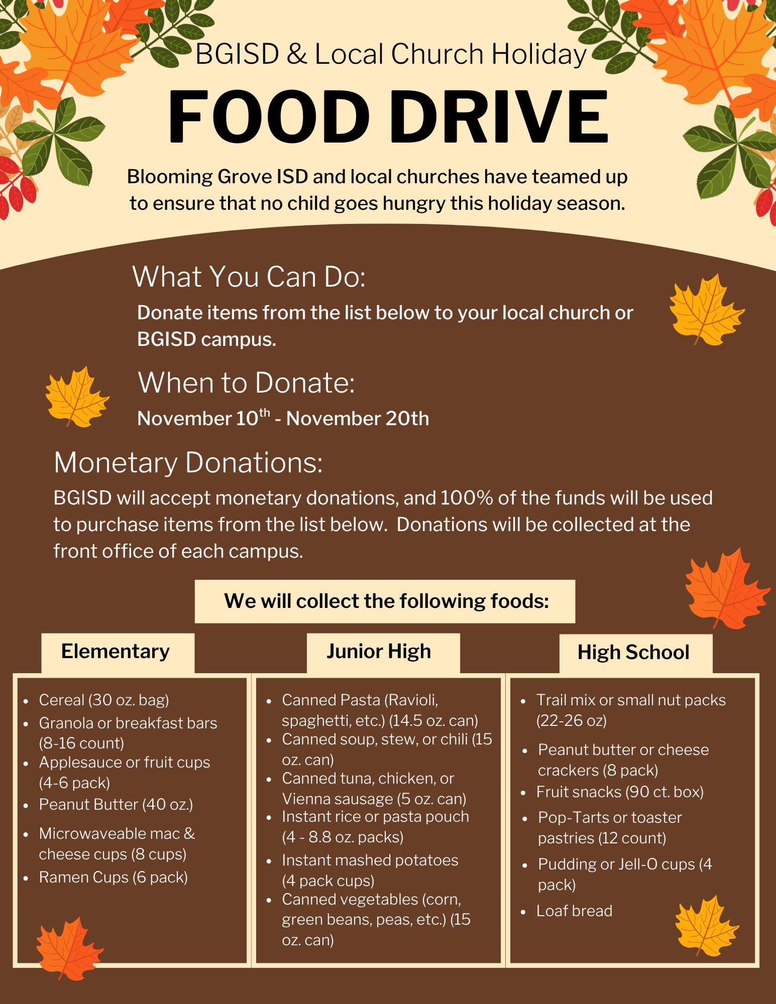 With the recent government shutdown and the increasing strain on many families, we know these are challenging times for our community. Blooming Grove ISD and our local churches have teamed up to ensure no child goes hungry over the holiday break.